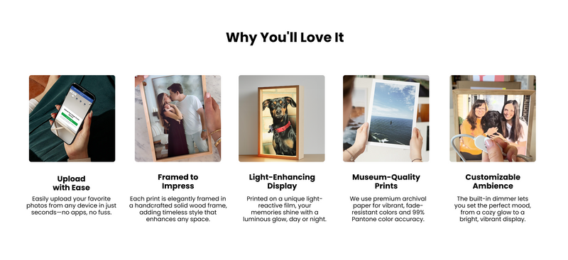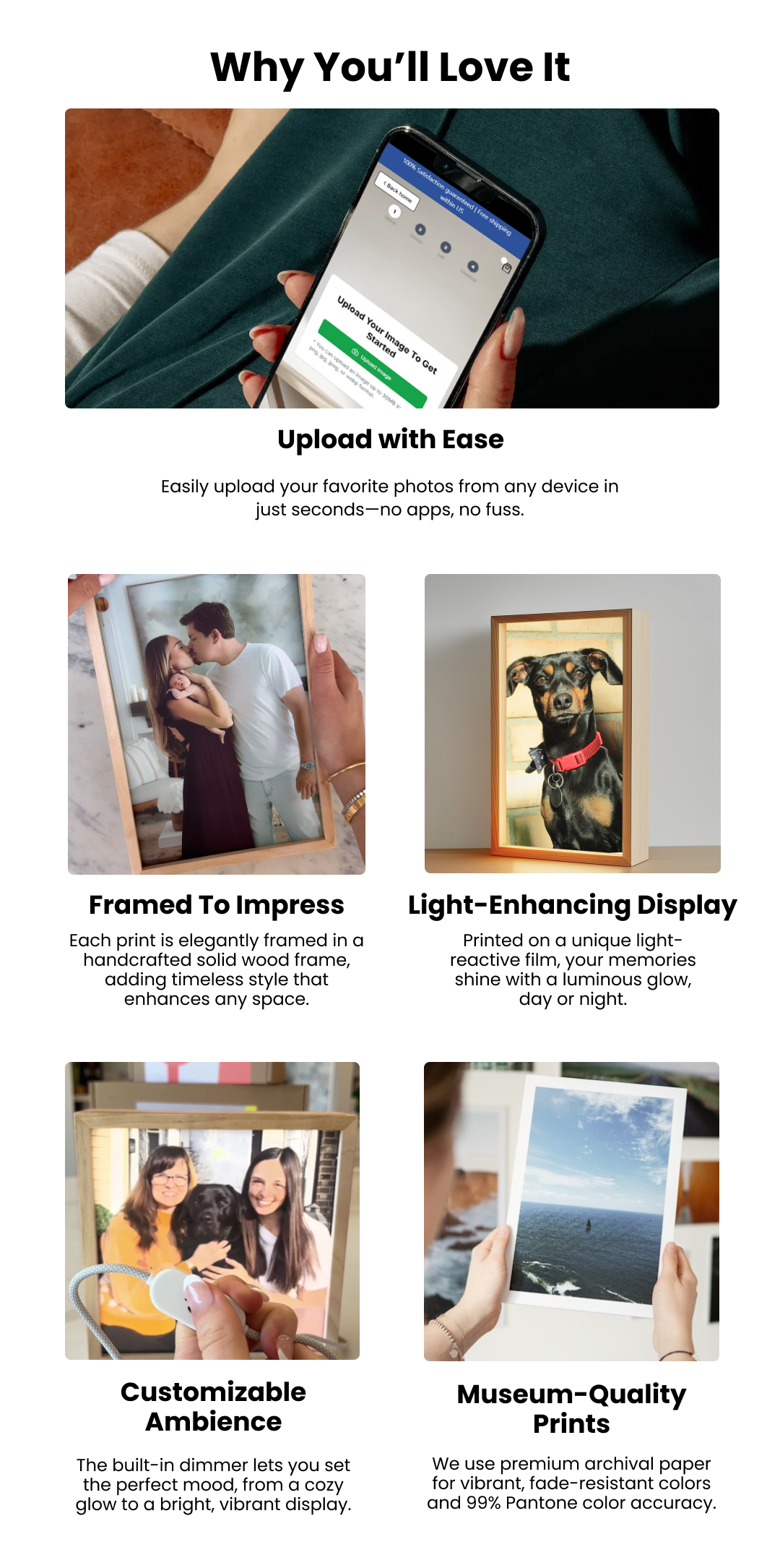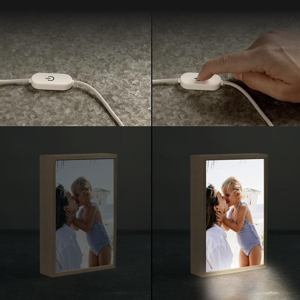Simply upload your photo, choose your perfect frame, and we'll take care of the rest. With a built-in dimmer, you can effortlessly adjust the ambiance- whether you're creating a warm, cozy atmosphere or a bright, vibrant display.